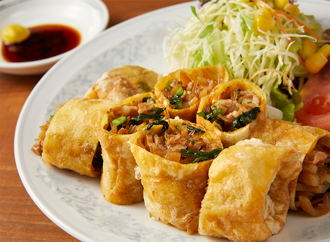 当店では北京風の薄焼き玉子の皮で包み、少し甘めに仕上げています。熟練の技でサクッ、フワッとした食感に。テイクアウトの際は切らずにお渡しもできますので、食べ歩きにもぴったりです。